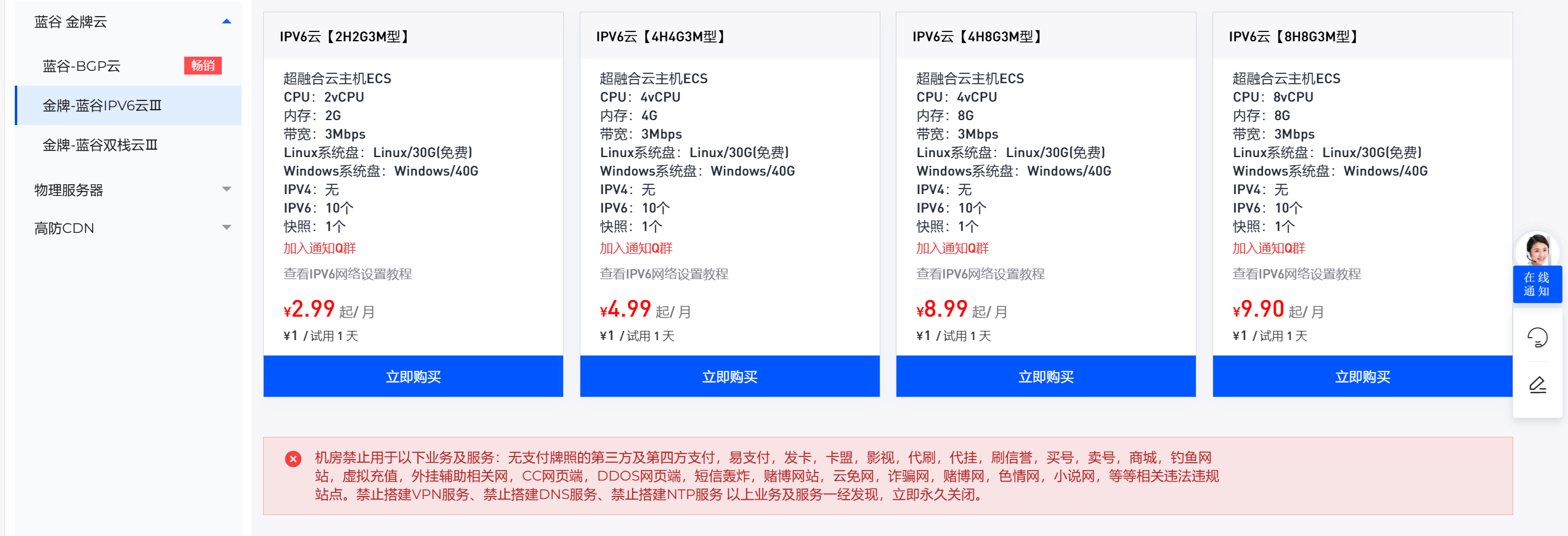 例如蓝谷科技(8465.cn)的纯ipv6服务器,【2H2G3M型】只要2.99元/月,年付28元,建个皮肤站绰绰有余。可以用优惠码ecustmc享受85折优惠。